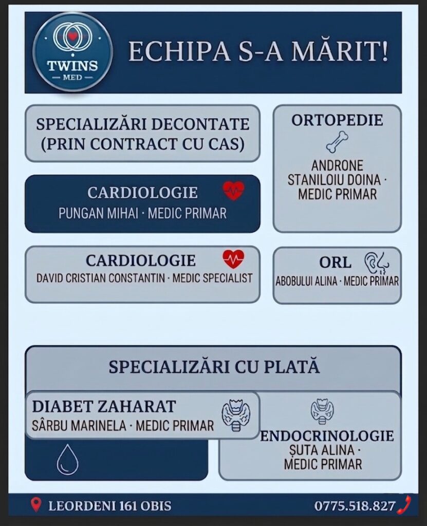 La TwinsMed, situată în Popesti Leordeni, sănătatea ta este pe mâini bune. Echipa noastră de medici dedicați din specializările Cardiologie, Ortopedie – Traumatologie, ORL, Urologie, Endocrinologie, Diabet și boli de nutriție combină experiența, empatia și cele mai noi tehnologii pentru a oferi îngrijire medicală de calitate. Fiecare dintre specialiștii noștri este pregătit să îți ofere tratamente personalizate, într-un mediu sigur și confortabil, pentru a-ți asigura o experiență medicală excelentă.